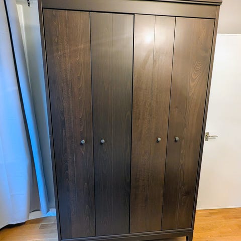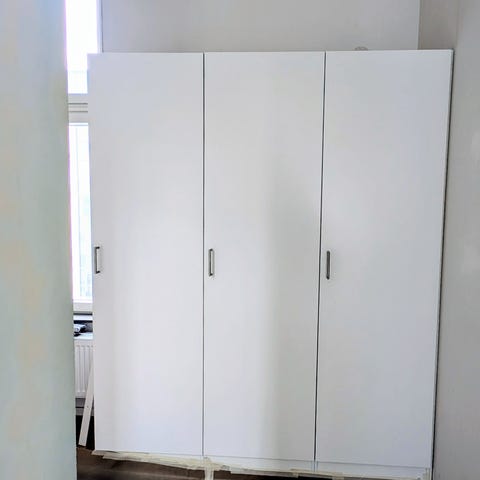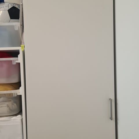 Nedmonterad Visthus grå/vit garderob med låda, hyllor, klädstång och belysning. Bra skick, men har två krokar på insida dörr (syns inte på utsidan) samt har två borrhål på höger sida/kant efter att en kroklist suttit där (se bild) pga detta har jag valt det skick som står i annonsen.
