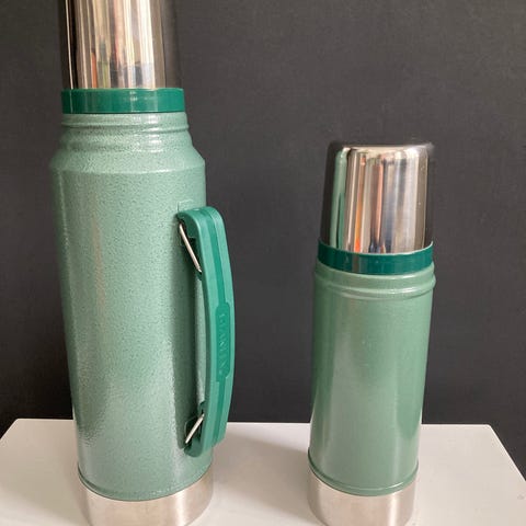 Stanley termos i grön färg med metallfinish. Termosen har skruvkork, lock som kan användas som mugg samt bärhandtag på sidan. Passar för varm eller kall dryck.