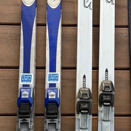 Klassiska längdskidor med Salomon bindningar. Till skidorna hör ett par längdstavar. De har bara använts ett fåtal gånger, men tyvärr har en av skidorna en tydlig skada i framändan som har uppstått under transporten i bilen, vet inte om skadan kan lagas.