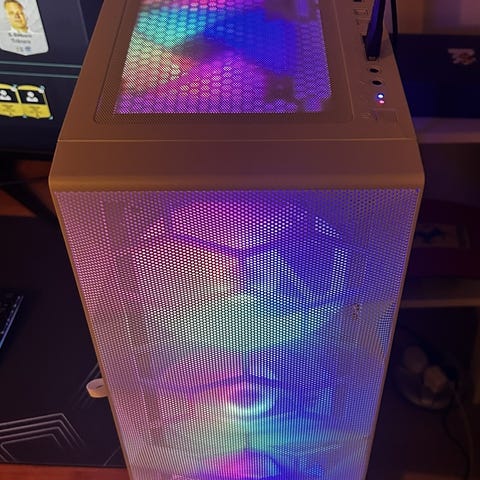 Stationär dator utrustad med grafikkortet Nvidia GeForce GTX 1650, 8 GB internminne, 120 GB SSD och 1 TB hårddisk. Datorn är monterad i ett vitt chassi med sidopanel i glas och blå belysning. Passar för allmän användning och spel inom ramen för den angivna hårdvaran. Exakta processor- och moderkortsmodeller framgår inte. Pris kan diskuteras