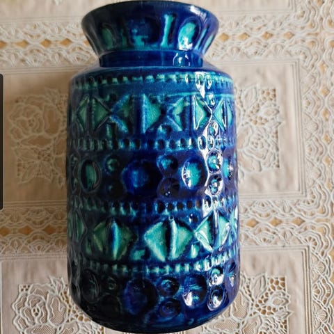 Scheurich vas i keramik, cirka 14 cm hög. Vasen har röd glasyr med svart mönstrad reliefdekor runt om. Insidan är glaserad i mörk ton. Passar för snittblommor eller som dekorativ inredningsdetalj. Märkt i botten med Scheurich West Germany och modellnummer.