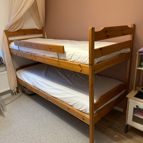Våningssäng i trä med två liggplatser. Sängen är tillverkad i trä med synlig trästruktur. Den har inbyggd stege på sidan och skyddskant på övre bädden. Båda bäddarna är utrustade med madrasser i standardstorlek för enkelsäng. Passar för exempelvis barn- eller gästrum.