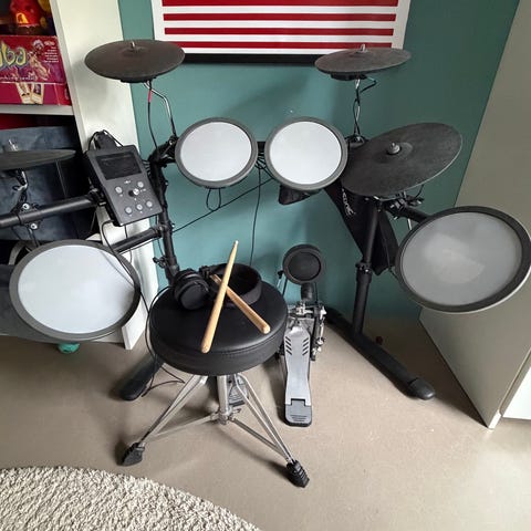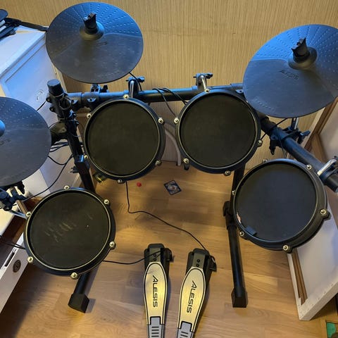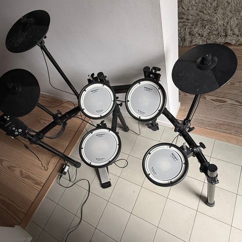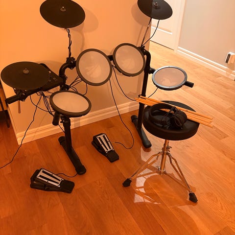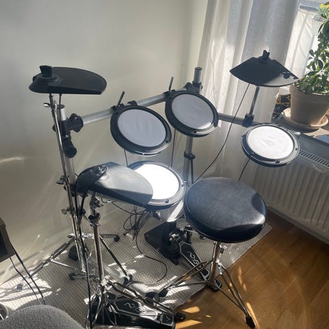 Bigbeat Kickit elektroniskt trumset med flera trumplattor och cymbalpads monterade på stativ. Trumsetet har en central kontrollmodul med olika trumljud, mönster och inställningar för volym och tempo. Medföljande trumstol och liten förstärkare syns på bilderna. Passar för övning i hemmet eller replokal där elektroniska trummor önskas med justerbar ljudnivå.