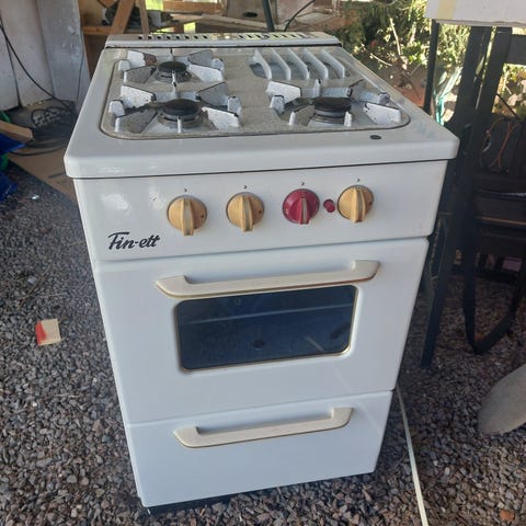 Spisen har flera kokringar, ugn samt traditionella luftreglage. Originaldetaljer och patina finns kvar vilket ger ett autentiskt uttryck.