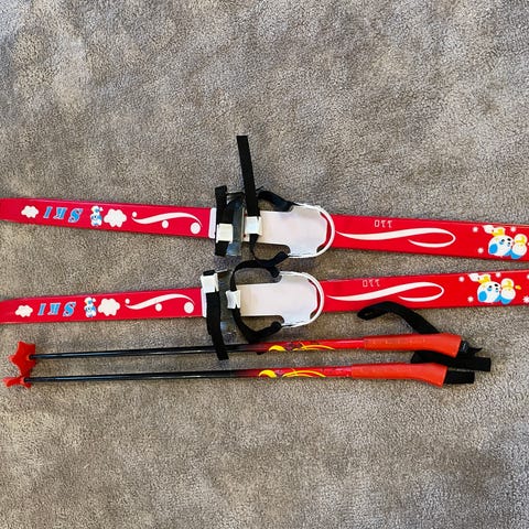 Längdskidor med tillhörande pjäxor och stavar. Vi säljer flera par skidor i olika längder, flera par längdpjäxor samt flera par stavar i barnstorlekar. Märkena på skidorna är Atomic, Capcir, Tecno pro och madshouse.