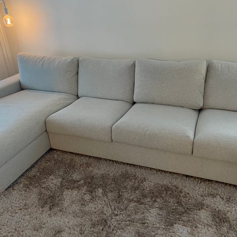 Bekväm sandfärgad soffa i sammetstyg med god förvaringsmöjligheter. Den går även att bädda ut.