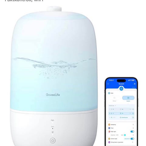 Clas Ohlson DF-HU28015 luftfuktare i vit färg. Enheten drivs med 220–240 V AC, 50 Hz och har en effekt på 95 W. På framsidan finns en panel med touchknappar för styrning av funktioner som av/på, inställning av fuktnivå och timer. Ovansidan har lock med öppning för påfyllning av vatten samt reglage för ångutsläpp. Luftfuktaren är avsedd för inomhusbruk för att höja luftfuktigheten i rumsmiljö.