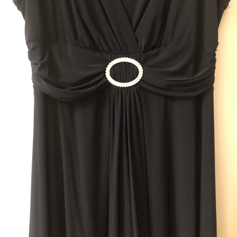 Ny Oanvända Elegant mörkblå klänning med snytdetalj i midjan och vacker clip/brosch med diamanter, stl. 44 (16)