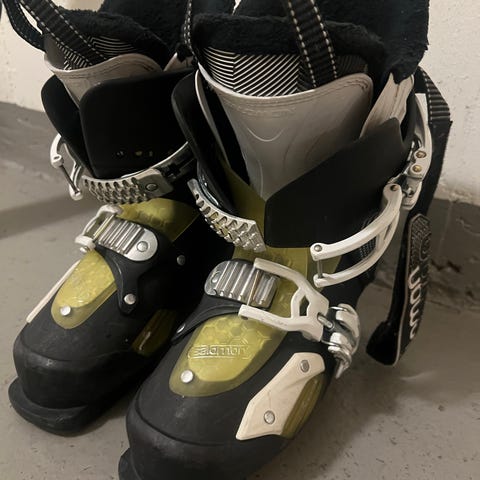 Slalompjäxor och skidor med justerbara bindningar anpassade för barn.