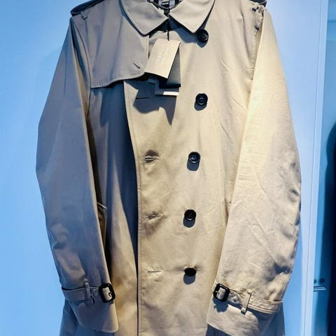 Burberry Harold New rock för herr i storlek 54 XL. Rocken är mörkgrå och tillverkad i ett tyg av 50 % ull, 35 % kashmir och 15 % polyamid, med foder i 100 % viskos. Modellen har rak passform, sidofickor och knäppning framtill. Plagget är avsett som ytterplagg och passar för användning under kallare årstider.