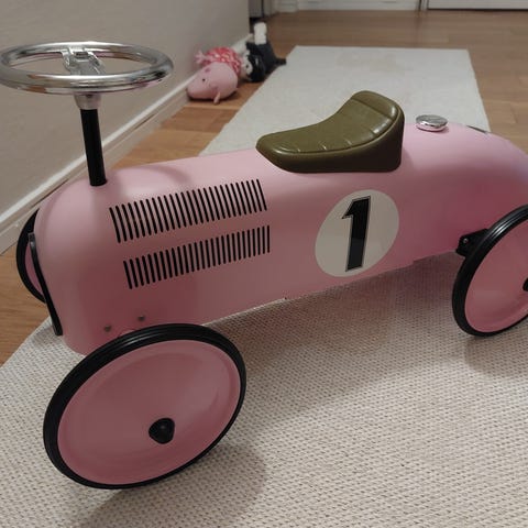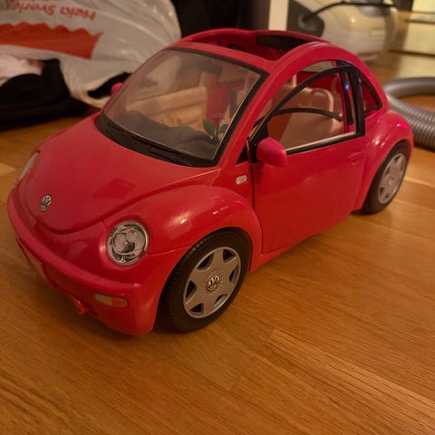 Rosa leksaksbil med två dockor