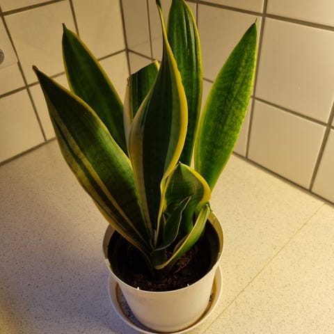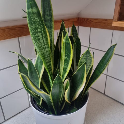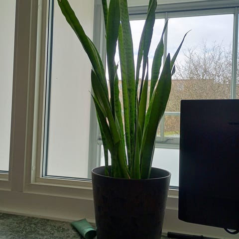 Svärmorstunga som krukväxt med höga, upprätta gröna blad med ljusare mönstring. Passar som inomhusväxt i fönster eller på golv i rum med indirekt ljus. Levereras i kruka enligt bild, storleken framgår av bilderna i förhållande till fönster och omgivning.