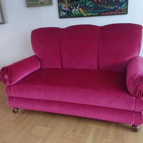 Fantastiskt fin, cool välvårdad retro soffa i röd sammet typ.