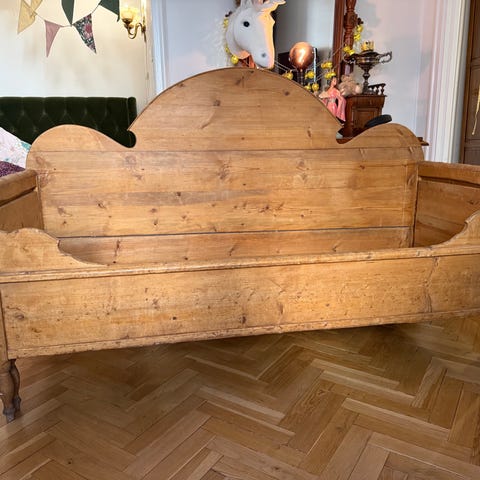 Antik/vintage bänk i furu med synliga märken och patina. Något ranglig så fungerar bäst som avställningsyta/dekoration.