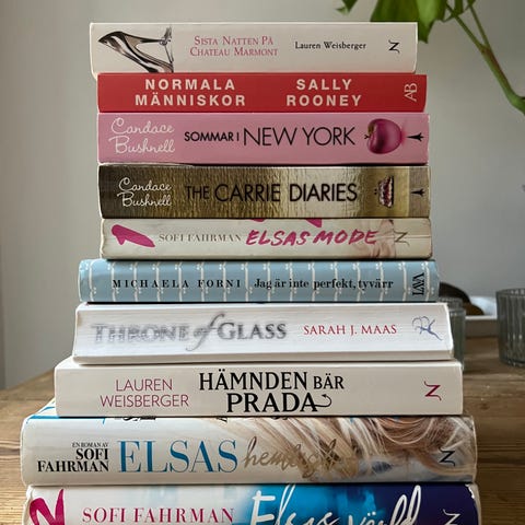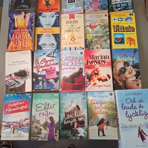 Bokpaket med blandade författare och titlar i både pocket- och inbundet format. Bland annat syns böcker av Lucinda Riley, Stieg Larsson, Camilla Läckberg, Liza Marklund, Kristina Ohlsson, Elena Ferrante, John Green och flera andra. Genrerna omfattar främst skönlitteratur, deckare, romaner, ungdomsböcker samt enstaka faktabok och sudoku-/pusselbok. Böckerna är på svenska och engelska och passar för läsare som vill ha en varierad samling med olika typer av berättelser och ämnen.