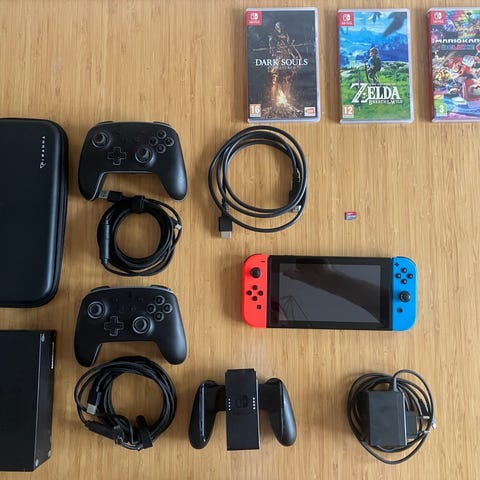 Nintendo switch med allt du behöver. Det som inte syns på bilden är ett 250gig minneskort som sitter i switchet. Dom genomskinliga kontrollerna tror jag kan vara defekta, men allt annat fungerar som det ska.