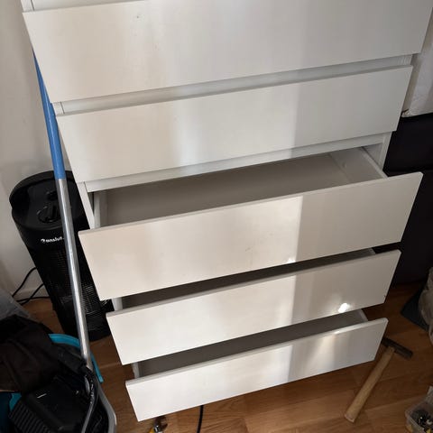 IKEA förvaringsmöbel med flera lådor i olika färger. Möbeln består av lådmoduler i blått och grönt med utskurna handtag på fronten. Stommen är vit invändigt. Passar för förvaring i till exempel barnrum, sovrum, hall eller förråd. Lådorna ger plats för leksaker, kläder eller andra mindre saker som behöver organiseras. Möbeln är fristående och kan placeras mot vägg eller i garderob beroende på utrymme.