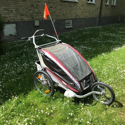 Två större hjul bak med reflexer samt dragarm framtill för montering på cykel. Förvaringsutrymme baktill. Handtag bak för att kunna skjuta vagnen vid gång eller löpning.