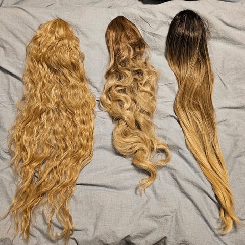 Bild 1) Vegansk ponytail. 40 cm. Brown Ash Blonde Balayage. Strandlockar. Medel volym. Nypris 599 kr. Bra skick, varsamt använd. Pris 300 kr.