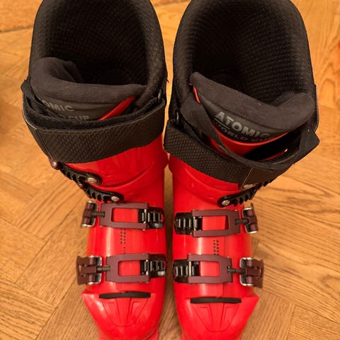 Atomic Hawx alpina pjäxor i röd och svart färg. Pjäxorna har flera justerbara spännen i metall framtill för att kunna anpassa passformen över fot och vrist. Ytterskalet är i plast med förstärkt häl- och ankelparti. Sulorna är anpassade för vanliga alpina bindningar. Passar för utförsåkning i skidbacke. Storlek 25/25.5. Nypris 1300kr