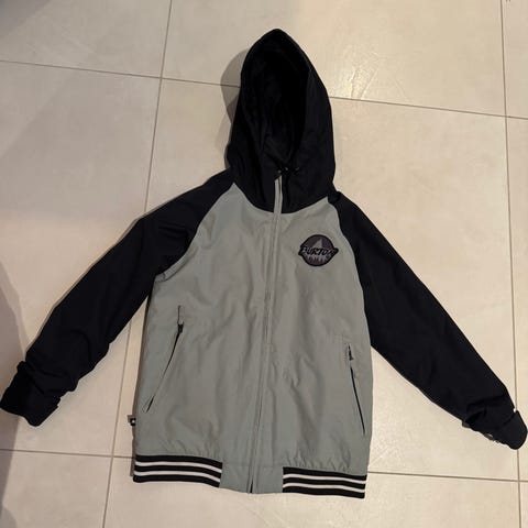 Burton jacka för barn i storlek S (US 7/8, EU/JP/H: 126–133). Jackan är huvudsakligen röd med marinblå partier och har grön insida. Modellen har huva och flera fickor med dragkedja. Materialet är vävt yttertyg med vadderad insida, lämpligt för kallare väder och utomhusaktiviteter som lek, skidåkning eller snowboard. Märke med Burton-logotyp finns på ärmen.