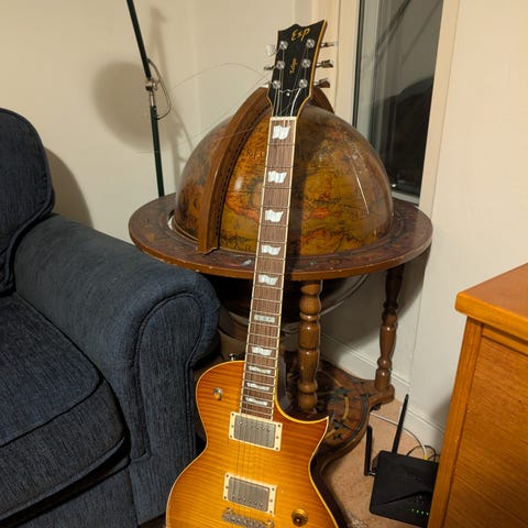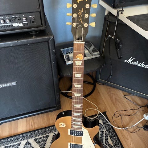 Kul gura i hyffsat skick! Sitter en sustainer i! Har bytt truss rod cover till ett med två skruvar. Originalet finns. Från runt 2000. Original stop bar följer med.