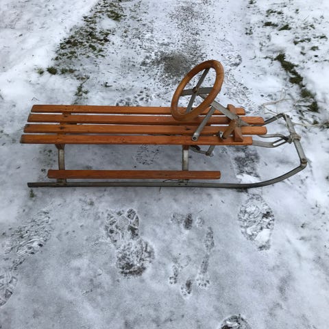Äldre träkälke med ratt och broms. Allt i gott skick. 1,25m lång.