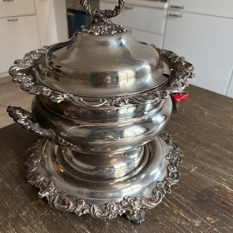 Mycket trevlig skål att servera soppan ur. Skålen har lejonhuvuden på två sidor. 14,5 cm hög och öppningen 15,5 cm i diameter.