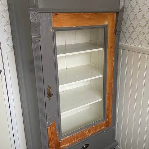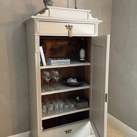 Lådor på höger sida samt en utfällbar hylla med små lådor bakom och hyllplan på vänster