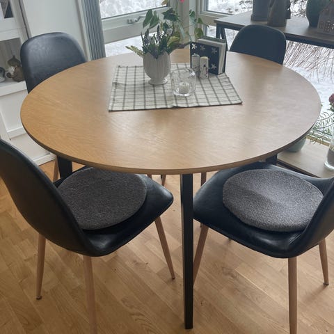Vi säljer ett väldigt fint matbord i ljust trä. Bordet är runt och med en diameter på 1 meter. Det är i fint skick men finns spår av användning, bl.a några repor på undersidan av skivan (men inget man ser annars) samt lite märken på benen. Bordet är väldigt enkelt att både montera upp och isär.