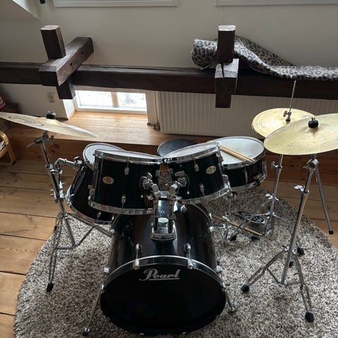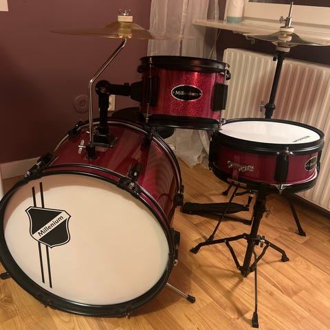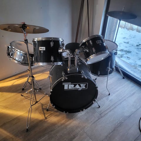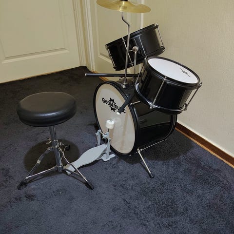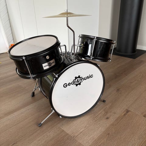 Fin barns trumset i svart färg. Setet består av bastrumma, virveltrumma, puka och cymbal. Medföljer trumstockar och trumstol enligt bild. Passar som kompakt trumset för barn för att leka eller öva.
