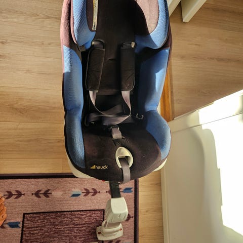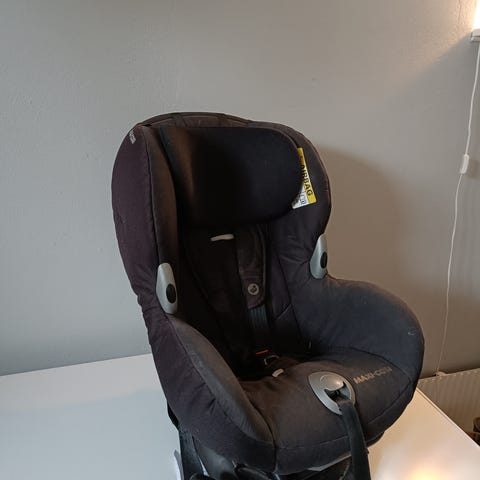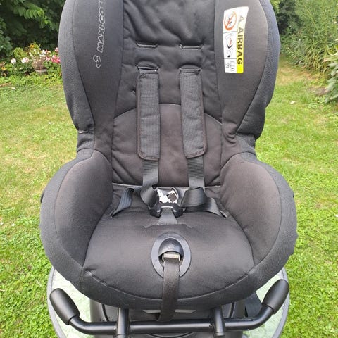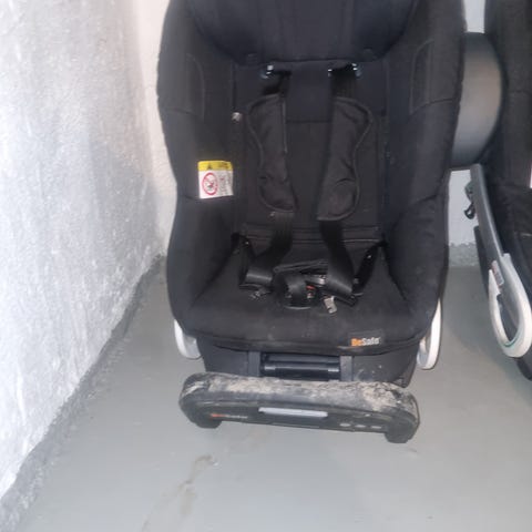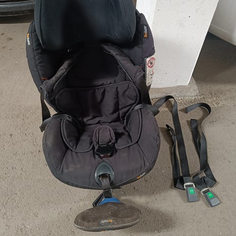 Bakåtvänd BeSafe Izi Plus med isofix infästning. Bilbarnstolen är i huvudsak grå med mörka kontrastpartier. Stödben saknas men har aldrig använts pga isofixinfästningen. Sätet har vadderad sits och ryggstöd för ökad komfort samt sidokuddar för extra skydd. Klädseln är av textilmaterial och kan tas av för rengöring enligt tillverkarens anvisningar.