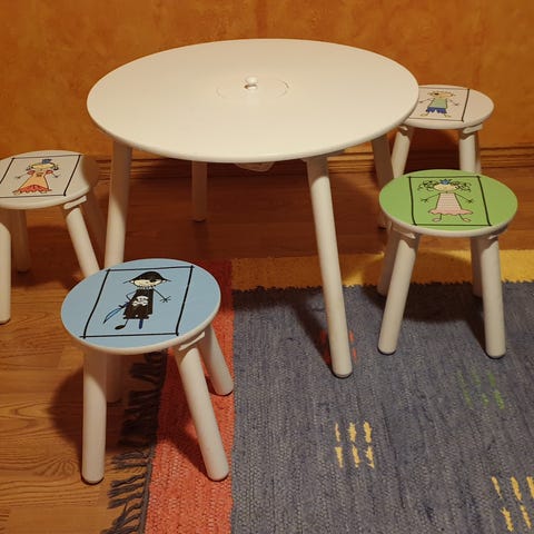 Barnbord med två matchande stolar i grå färg från Minitude Nordic. Rund bordsskiva med fyra ben. Stolarna har rund sits, fyra ben och ryggstöd formade som två öron. Setet är anpassat för barn och passar till exempel i lekrum, barnrum eller som pysselhörna.