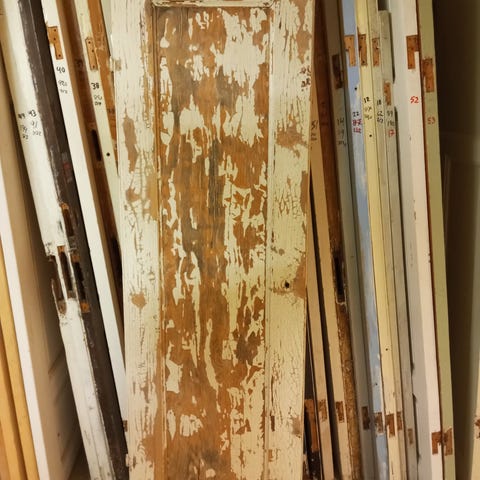 Träinnerdörr i klassisk spegeldesign, målad i beige/ljus kulör. Dörren har flera rektangulära speglar och är avsedd för inomhusbruk. Passar exempelvis i bostad eller lokal där man vill ha en traditionell innerdörr i trä. Exakta mått och gångjärnssida behöver kontrolleras vid köp.