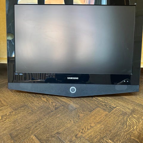 Samsung TV i svart utförande. Platt skärm med bordsstativ. Baksidan visar anslutningar för bland annat HDMI och andra ingångar. Passar som TV eller extern skärm till exempelvis dator eller spelkonsol, beroende på anslutningsmöjligheter. Skärmen har vissa synliga märken och bakstycket visar spår av användning enligt bilderna. Ingår strömsladd och Hdmi sladd, däremot fjärrkontroll saknas.