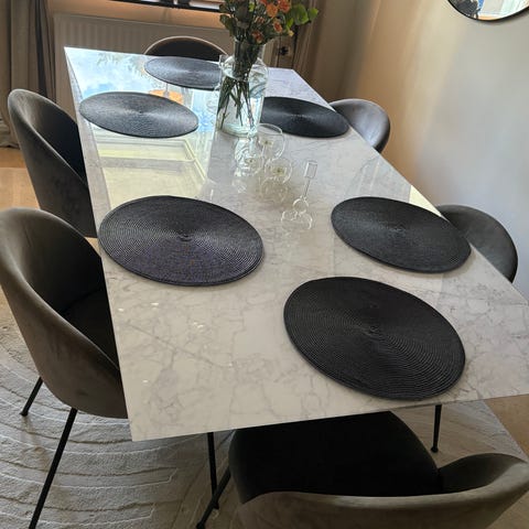 Defekt då bordet gungar en del. En lite spricka i skivan. EJ ÄKTA MARMOR. Ej stolar