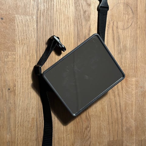 Onco bilbarnspegel i svart plast för montering på bilens nackstöd. Spegeln är rektangulär med rundade hörn och har justerbara remmar med snabbspänne för att fästa den runt nackstödet. Vinkeln kan justeras för bättre sikt mot barn i bakåtvänd bilbarnstol.