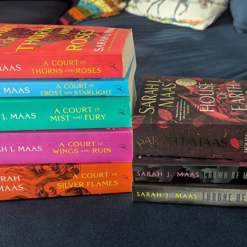 Bokpaket med tre böcker av Sarah J. Maas ur A Court-serien på engelska. Paketet innehåller titlarna "A Court of Thorns and Roses" (1an), A Court of Wings and Ruin" (3an) och "A Court of Silver Flames" (5an). Böckerna är i pocketformat och är på engelska. Lästa 1 gång/styck och väl omhändertagna.