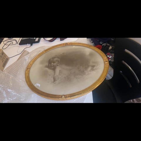 Oval spegel med dekorativt utformad guldfärgad ram. Spegeln har en utsmyckad överdel med band- och bladdekor. Passar exempelvis i hall, sovrum eller vardagsrum som väggspegel. Materialet i ramen är målad träkonstruktion med guldfinish.