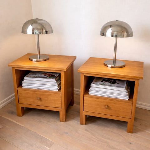 Vitt sängbord med två hyllor, på hjul för enkel förflyttning. Litet märke uppepå, se bild. Djur- och rökfritt hem.