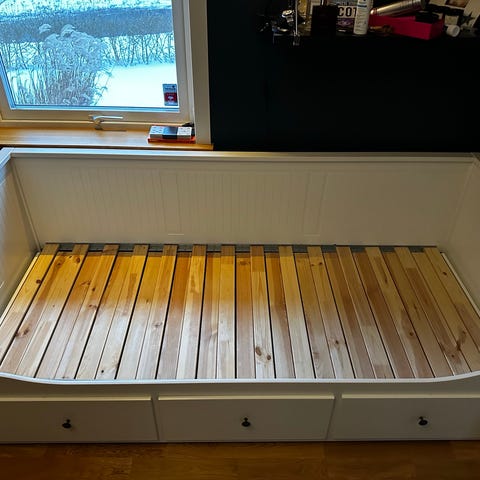 IKEA hemnes dagbädd i vit färg med tre utdragslådor för förvaring. Sängbotten består av träribbor. Passar som säng eller extrasäng i sovrum, gästrum eller barnrum.