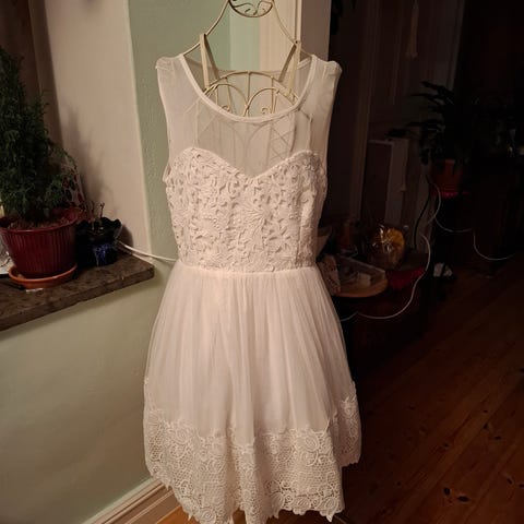 En vit klänning från Forever21 i storlek Medium. Klänningen har en fin spets och är längre baktill. Jag har själv inte använt klänningen eftersom den är för stor för mig.