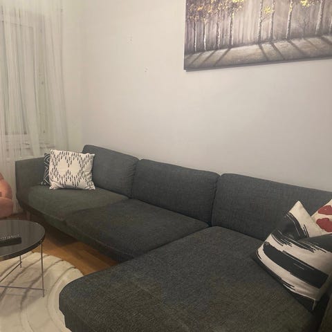 Comfortable gray corner sofa with seating for up to 6 people. Modern design, sturdy, and well-maintained. Ideal for living rooms and open-plan spaces.