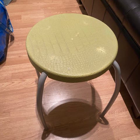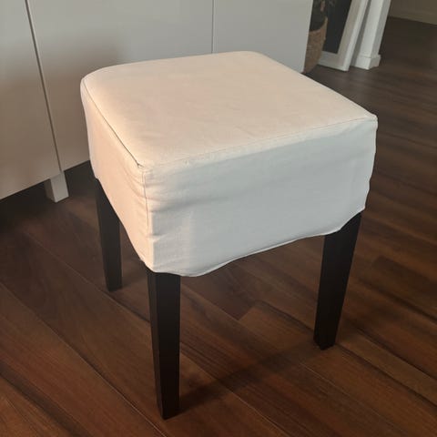 Sittpall med grått ”lurv” & vita ben. Finns ett litet märke på ena benet