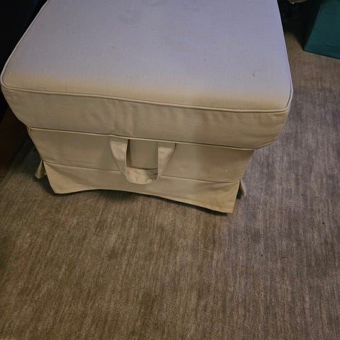 Nätt fotpall med rutigt beige tyg i fabrikatet Furinova, lättplacerad pall som även funkar som extra sittpuff.