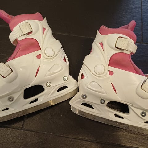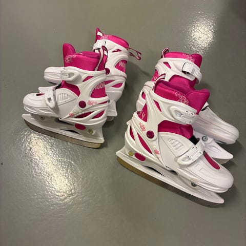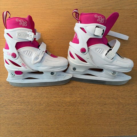 Revolution justerbara skridskor för barn. Justerbar storlek 29–32. Vit med rosa detaljer. Modellen har hårt skaft med spänne och rem för att ge stöd runt fot och ankel. Använd en del men fortfarande i bra skick. Några enstaka repor/märken.