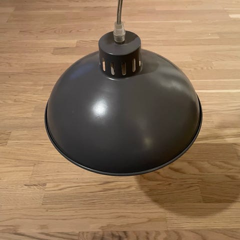 Konformad skärm i borstat metallutförande med vit sladd. Passar som belysning över bord, i kök eller vardagsrum. Klassisk och enkel design med fokus på riktad nedåtriktad belysning.