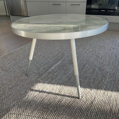 Snyggt och stabilt soffbord med rund glasskiva och ben i borstad metall. Modern och tidlös design som passar de flesta vardagsrum. Glasskivan ger ett luftigt intryck och är lätt att hålla ren. Bordet står stadigt och är i gott skick med normalt bruksslitage.