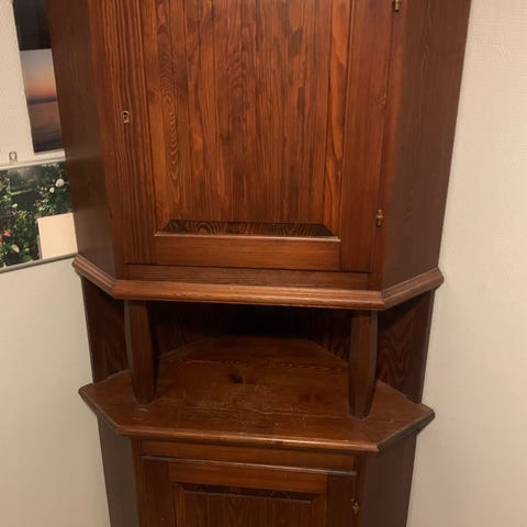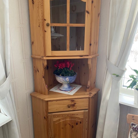 Vackert hörnskåp tillverkat i massiv furu med naturlig träfinish. Denna klassiska möbel har: