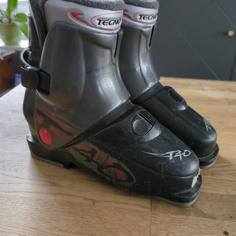 Tecnica pjäxor i storlek 29,5. Flerkläppsspännen i metall och justerbara remmar upptill. Ytterskal i hårdplast med detaljer i svart och orange, innersko i vadderat textilmaterial. Passar för alpin skidåkning.